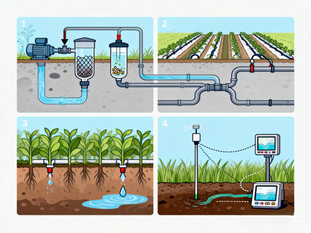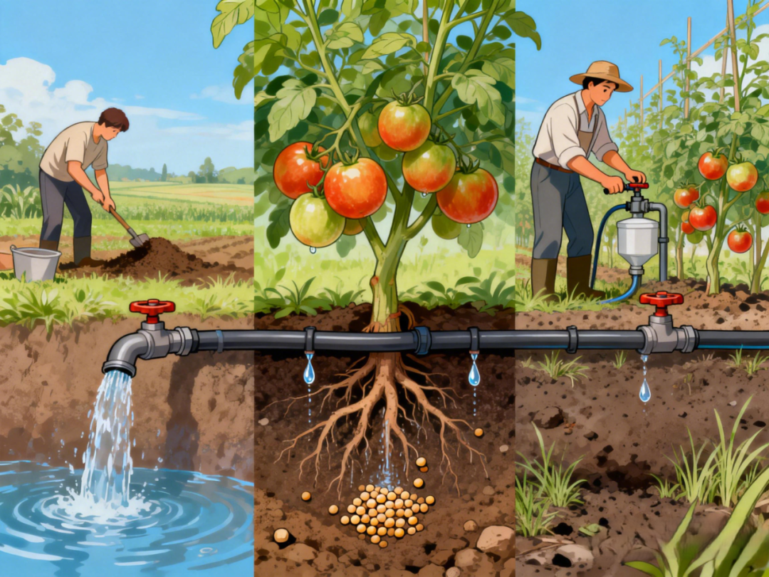 一套标准的水肥一体化系统,由四大黄金搭档组成。 水源与首部枢纽动力心脏 包括水泵、过滤器和施肥器等核心设备。过滤器至关重要,它能清除水中的杂质,防止堵塞后续精密的滴头。施肥器则负责将肥料按设定比例吸入灌溉管道。 输配水管网输送血管 由主、支、毛三级管道组成。主支管常埋于地下,负责将水肥输送到田间。滴灌带铺设在作物间,是营养输送的最后一公里。 灌水器 精密针头 最常见的滴头或滴箭,它们以极慢的速度将水肥一滴一滴地均匀滴出,精确浸润作物根部土壤。 控制系统智能大脑 基础版可手动开关,升级版可通过土壤传感器、气象数据和控制器,实现自动灌溉施肥,即系统感应到土壤变干了,就自动开启施肥程序,按预设配方精准执行。